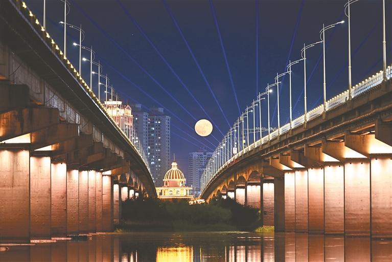 本报11日讯(记者郭俊峰)11日晚,本年度“最低满月”现身天宇。当日20时23分,在夜空的映衬下,一轮淡红色的圆月从哈尔滨公路大桥上缓缓升起,月光洒满松花江面,市民坐在江边,赏着圆月,听着江水声,感受夏夜的别样静谧。