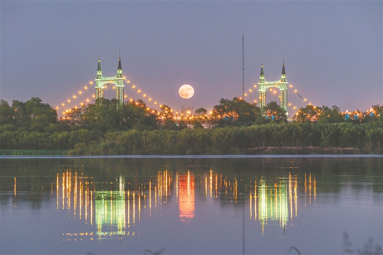 松花江上,一轮圆月缓缓升起。本报记者 郭俊峰摄