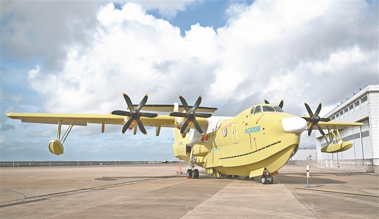 11日,在珠海中航通飞华南飞机工业有限公司,现场展示的批量生产的首架AG600飞机。