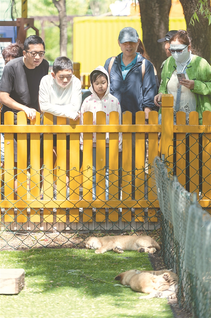 六月十一日,游客看着熟睡的东北虎幼虎和非洲狮幼狮。 新华社记者 谢剑飞摄