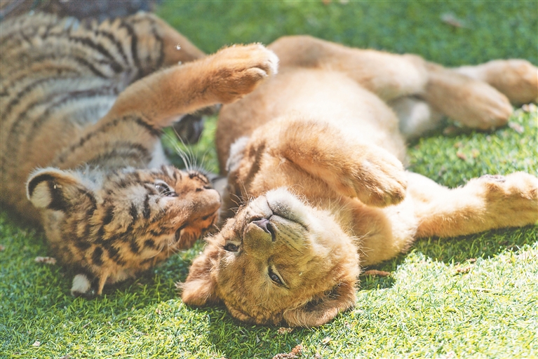 东北虎幼虎(左)和非洲狮幼狮一起玩耍。新华社记者 谢剑飞摄