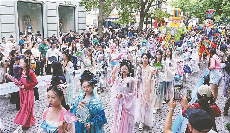 活动现场,中俄文化元素交相辉映,营造出浓厚的艺术氛围。中华传统文化大放异彩,汉服巡游队伍缓缓前行,古典雅致的汉服与中央大街的欧式建筑相互映衬,展现出独特的东方韵味。来自俄罗斯的艺术家们带来了原汁原味的表演,将观众带入广袤的俄罗斯大地。幽默风趣的杂耍小丑、形态各异的毛绒玩偶以及充满科技感的金刚机甲等表演与互动环节,让现场氛围持续升温,欢声笑语不断。