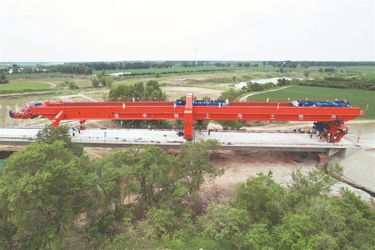 本报15日讯(郭懿 刘绪军 记者王迪)15日,随着一榀714.8吨的预制箱梁精准架设在永兴呼兰河特大桥尾墩,哈伊高铁(哈尔滨至铁力段)永兴呼兰河特大桥箱梁架设全部完成,比计划工期提前一个月,为后续铺轨奠定了坚实基础。