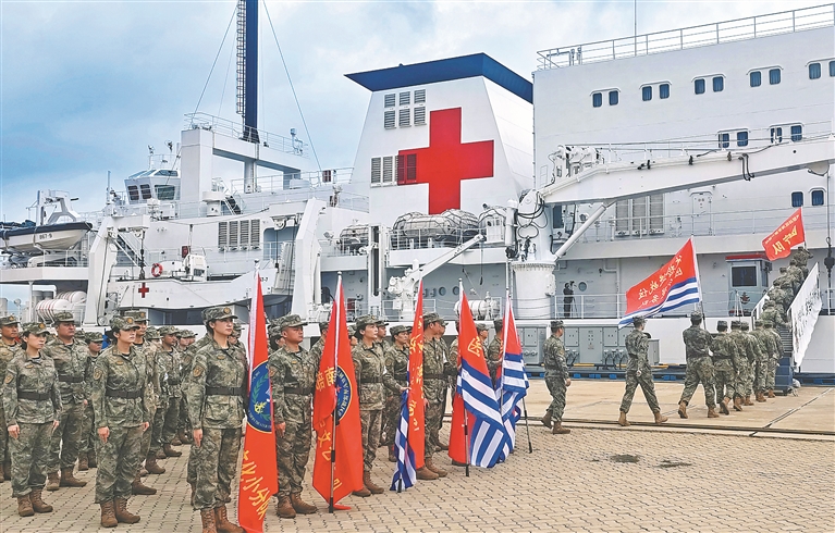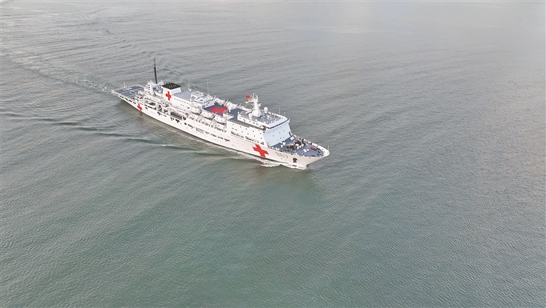 上图:6月16日,中国海军“丝路方舟”号医院船从海南三亚某军港解缆起航,赴南海各岛礁执行“健康送海疆”任务(无人机照片)。