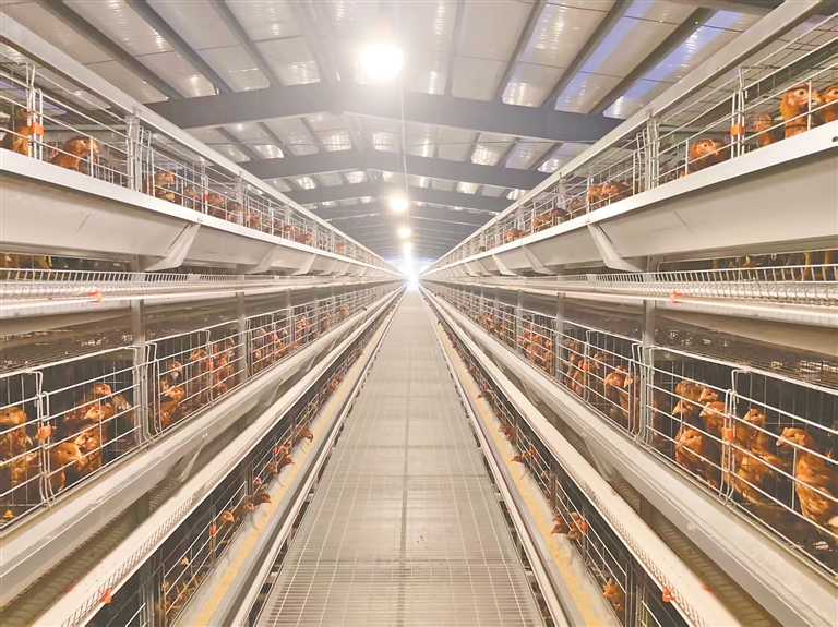 新建鸡舍配备了先进的全自动智能系统,饲喂、清粪、饮水、集蛋、消毒、通风等环节实现了全流程智能化管理。每栋鸡舍采用5列6层立体设计,大幅提升鸡舍空间利用率,让14.2万只蛋鸡有序安置。