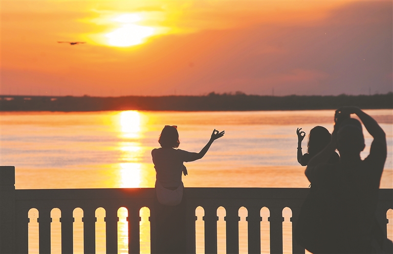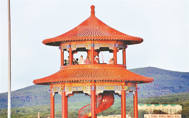 广场上游客很多,有的在界碑旁拍照,有的在观赏界江美景,有的登上观光塔远眺,有的乘坐客船游界江。近一段时间,许多南方游客来到抚远避暑游玩,东极广场是大家打卡的必到景点。