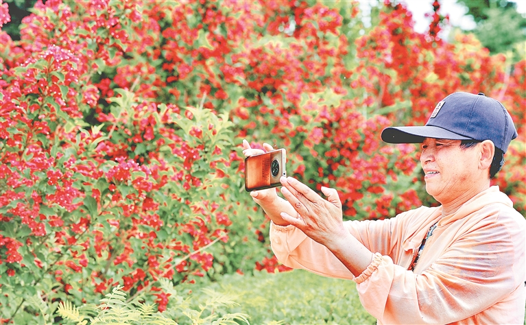 抚远市迎宾路附近的滨江公园内,游人在观赏、拍摄美丽的锦带花。