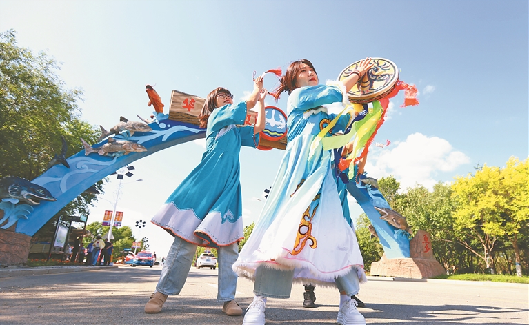 赫哲族舞蹈迎宾客。本报记者 韩东贤 苏强摄