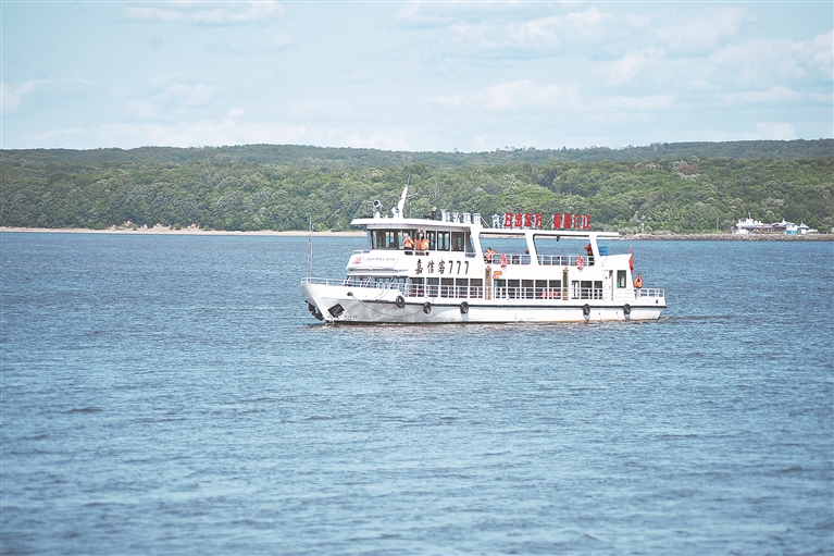 抚远市东极广场边,游客乘船游界江。 本报记者 韩东贤 苏强摄