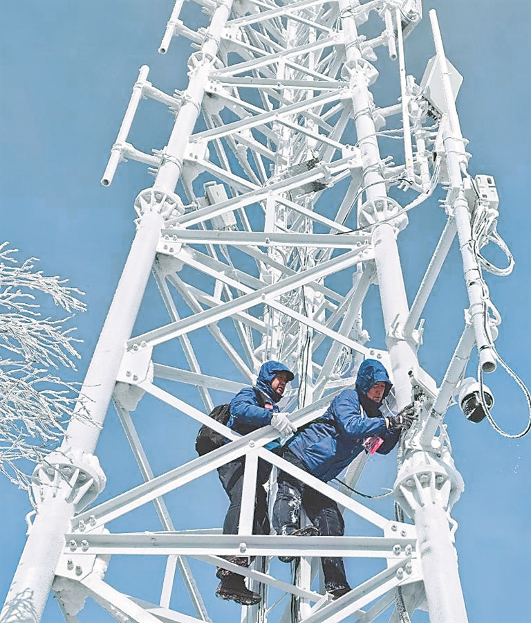 冬日里,黑龙江省联通的员工在通信塔上检修。资料片