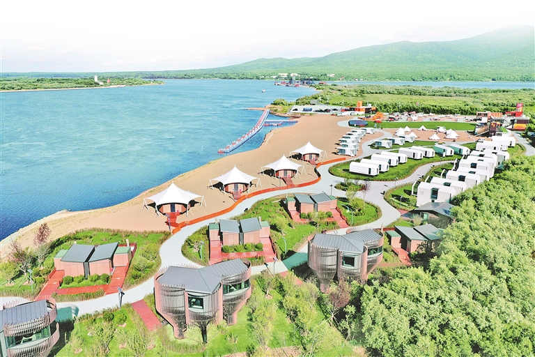 夏日的抚远市贝壳沙滩营地内,游客们有的在喝啤酒吃烧烤,有的在玩各种游乐项目,有的在拍摄美丽风景……