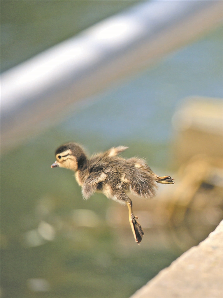 作为禽鸟,小鸳鸯在破壳两三天后,必须离巢才能得到食物的补给,否则就会饿死。所以,跳巢是它们走向世界的第一步。无论巢穴有多高,它们必须跳出来,然后跟着妈妈走到附近的湖泊,游进水里,才能吃到食物,并远离天敌的伤害。