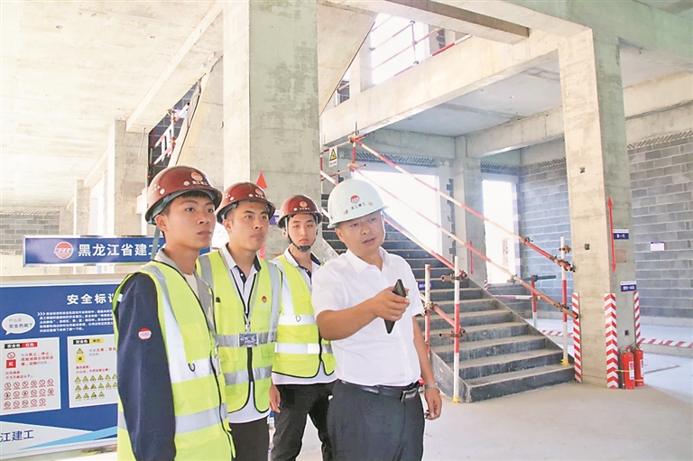 2021年夏天,哈尔滨国贸大厦施工现场,烈日炎炎中一个身着灰色工装、头戴安全帽的身影来回穿梭。他不时地俯身检查钢筋绑扎间距,与技术人员比对图纸数据,汗水早已浸透衣背。