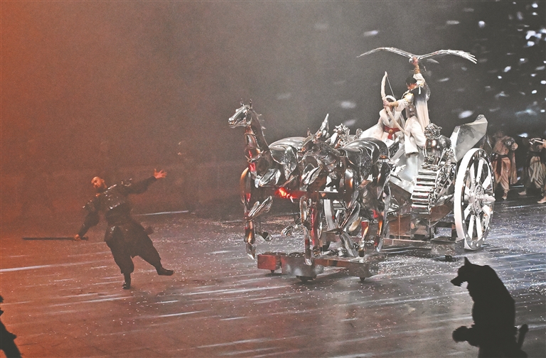 据了解,2.0版本《王的战车》以北方部落的古老传说为蓝本,不仅在剧情、阵容、声光电配合上进行了升华,还融入了AR互动技术,深度融合沉浸式游戏化体验与震撼视听特效,增加了高空绸吊等特技、杂技元素,打造观众可实时参与剧情的虚实交融演出盛宴。演出通过一场舞台秀让观众亲历“完颜阿骨打”的蜕变历程,让哈尔滨这座英雄城市的精神图腾在当代舞台上重焕新生。