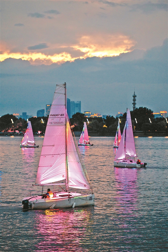 傍晚松花江江边的多彩帆船。