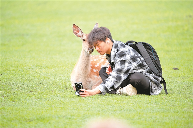 伊春金山鹿苑游客与鹿合影。