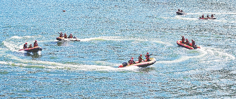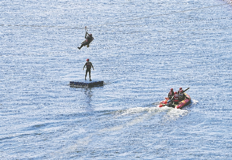 演练模拟阿城区突遭特大暴雨侵袭,西泉眼水库水位急速上涨,超过警戒阈值,桥梁断裂形成孤岛,大量人员被困落水,险情十万火急。水面之下,无人船将水流、水深及目标物信息实时传回,为指挥部决策提供关键支撑。空中,直升机迅速飞抵孤岛上空,放下绞盘,将救援人员安全送达。