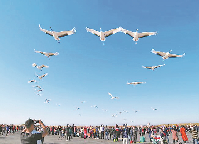 游客观赏展翅飞翔的丹顶鹤。本报记者 孙昊摄
