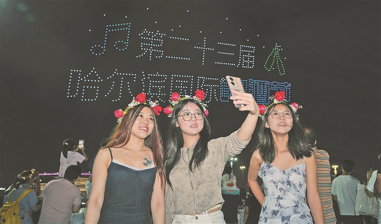 当高空烟花在园区上空璀璨绽放、千架无人机围绕“雪韵丁香”火炬塔腾空而起、百余架量身定制的烟花无人机演绎绝美画面,光影流转间,夜空被点亮,“夏遇冰城”的浪漫瞬间拉满。