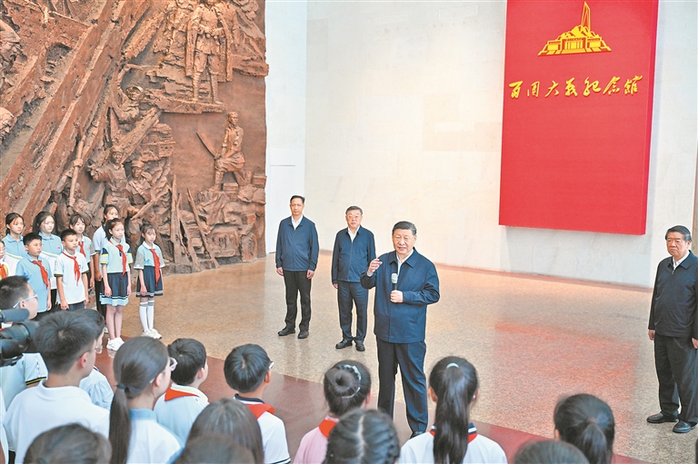 在纪念馆大厅,习近平同前来参观的青少年学生和纪念馆工作人员亲切交流。他说,88年前的今天发生的“七七事变”,是中华民族全面抗击日本侵略者的起点,前事不忘、后事之师,到这里来就是接受精神洗礼。广大青少年生逢其时,要赓续红色血脉,树立强国有我的远大志向,做堂堂正正、光荣自豪的中国人,勇担民族复兴的时代大任。