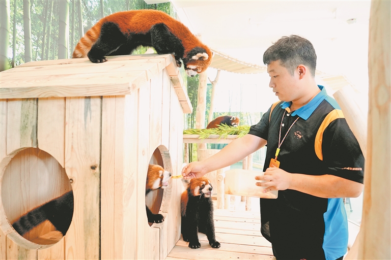 小熊猫是国家二级保护动物,野外种群数量不足万只。保育员团队精心准备小熊猫的饮食,专门从四川空运新鲜竹子并搭配多种营养餐食,确保小熊猫们健康成长。