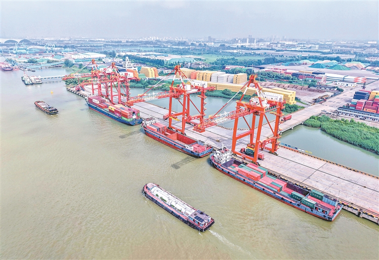 这是7月13日拍摄的江苏省扬州港作业场景。