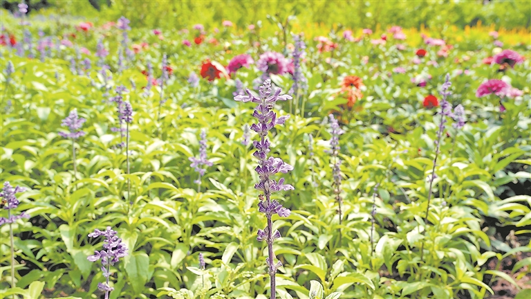 走入百花园,各色花朵争奇斗艳,游人的相机快门声此起彼伏。“这是鼠尾草,这是木绣球,这是三色堇……这边是白粉色为主的搭配设计,这边则是蓝色调紫色调的搭配。”商凤杰向记者介绍着百花园里的各类花朵,以及颇有讲究的花卉园艺景观搭配设计。