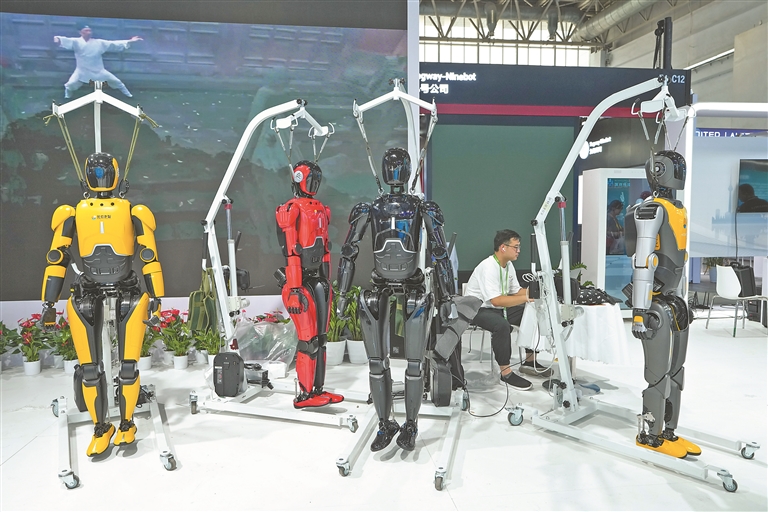 7月14日,在第三届中国国际供应链促进博览会数字科技链展区的“湖北人形机器人产业链专题展区”,工作人员在布置展品。