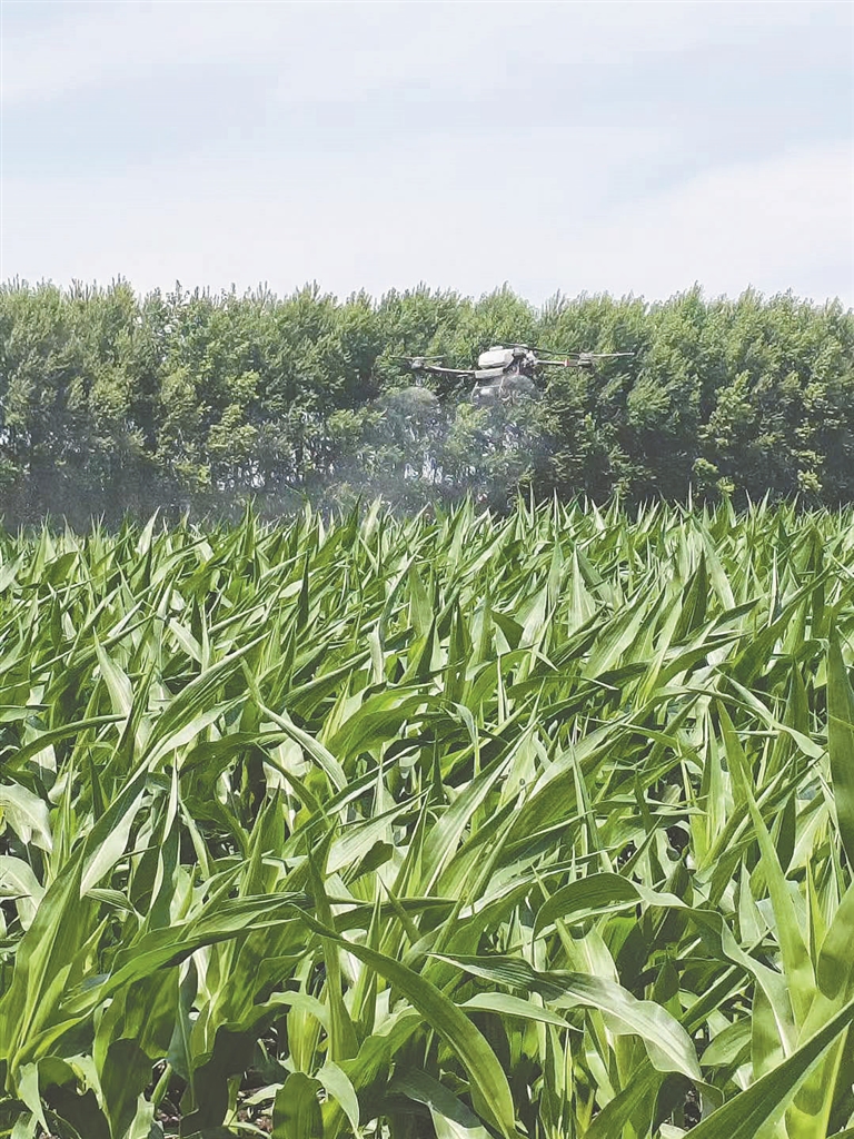 前进镇东兴现代农机农民专业合作社的无人机专业飞防大队,成为田间管理的重要力量。镇农业服务中心主任赵长松介绍,目前该合作社共有45台套大疆T60型号无人机,专业技术飞手27人,不仅完成自家合作社的飞防作业,还为全镇及周边乡镇提供服务。“这些无人机可帮了我们大忙,相比传统人工,无人机飞防效率提高50倍以上。2025年作业队飞防作业面积预计可达到50多万亩,实现利润100余万元。”赵长松感叹道。按照喷施作物需求,将配比搅拌后的生物制剂加入植保无人机后,工作人员只需操控手柄,无人机便按照预设的航线与高度开展喷洒作业。