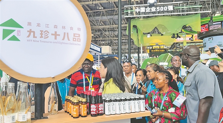 “九珍十八品”展位,处处体现着龙江森林元素。展台前,来自全球的客商被这些带着黑土气息的产品吸引。一位来自非洲的采购商品尝了桦树汁后,竖起大拇指:“非常甘甜,森林韵味十足。”“九珍十八品”展位以森林食品矩阵为核心,全方位展现了从生态资源到森林食品的全产业链发展范式。黑蜂椴树蜜、花青素、桦树汁、榛蘑等特色产品生动诠释了黑龙江打造大食物观实践地的理念。