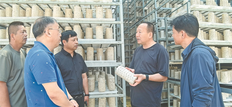 管理人员与技术人员一起探讨黑木耳生产技术。