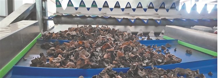 离智能大棚不远就是采摘和烘干车间,长满黑木耳的菌包由自动叉车运到车间里摆上自动采摘流水线,一圈下来也就十几分钟,黑木耳就蹦蹦跳跳地从传送带上进入烘干机。“烘干25分钟,能达到四成干,这主要是应对阴雨天气,避免黑木耳品质下降和产量受损。”
