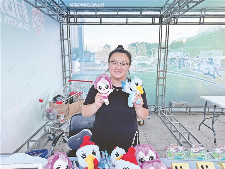 在比赛场地对面,“村BA云集”火热开市。文创潮品、农产品、小吃等来自东北四省(区)的产品在云集中展销。