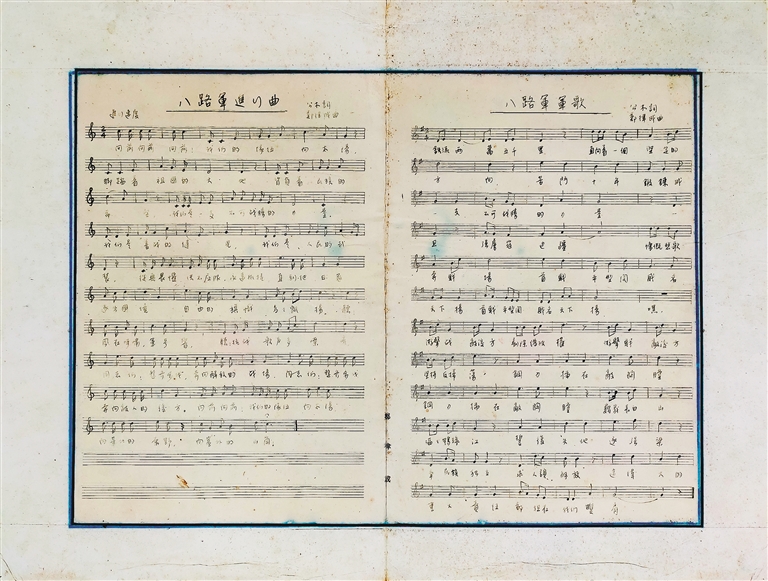《八路军进行曲(中国人民解放军军歌)》及《八路军军歌》曲谱手稿。