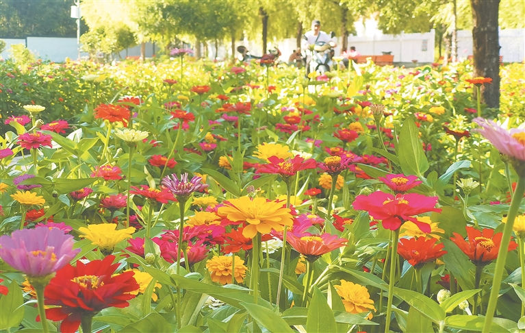 大陆南公交首末站南侧的兴安枫叶园,1.65公顷的天地里,1.2公顷的绿化面积被装点得疏密有致。2200株拧筋槭、五角枫、九角枫、糖槭亭亭玉立,静待秋日“燃”起;15.5万株百日草、醉蝶、波斯菊、荷兰菊铺就7800平方米的花毯,随季节变换着色彩;5800平方米的白三叶、草熟禾草坪如茵,踩上去软绵绵的,成了孩子们奔跑嬉戏的“天然地毯”,也成了居民散步歇脚的“绿色沙发”。