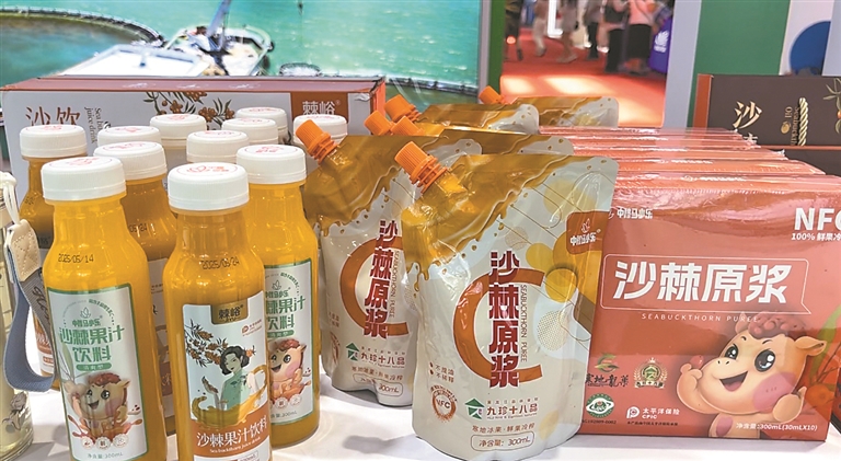 沙棘原浆、沙棘果汁、沙棘籽油、沙棘果油、沙棘冻干粉……从扎根寒地的沙棘到展位上琳琅满目的系列产品,黑龙江中穆沙棘产业有限责任公司让这个“维生素宝库”实现了全利用。