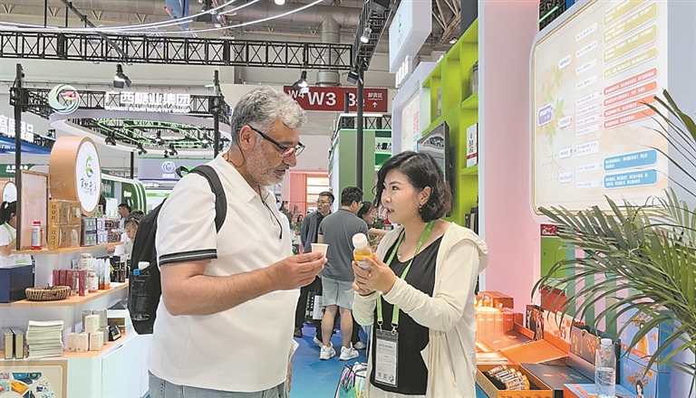 工作人员为客商介绍产品。