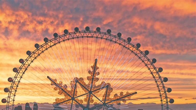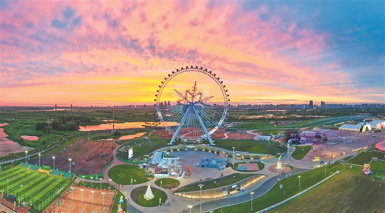 29日傍晚,一场大雨过后,哈尔滨的天际出现一抹靓丽的晚霞。站在冰雪大世界东侧向西望去,太阳落入地平线之前,将自己的余晖披到云彩身上。