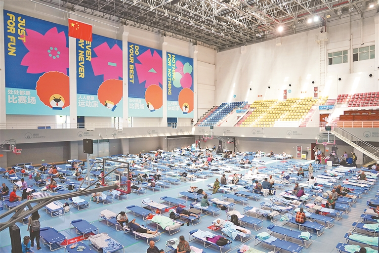 这是7月29日拍摄的北京市平谷区体育中心安置点。 当日,记者探访北京市平谷区体育中心安置点。该安置点接收了平谷区镇罗营镇7个村庄的400多名村民,在保障群众住宿、饮食、医疗等基本需求外,还准备了丰富的文化娱乐活动。 据介绍,自27日至28日本轮强降雨以来,北京市平谷区共转移12879人次,启用体育馆、酒店、学校、村委会、民宿等集中安置点40处。 新华社记者 张晨霖摄