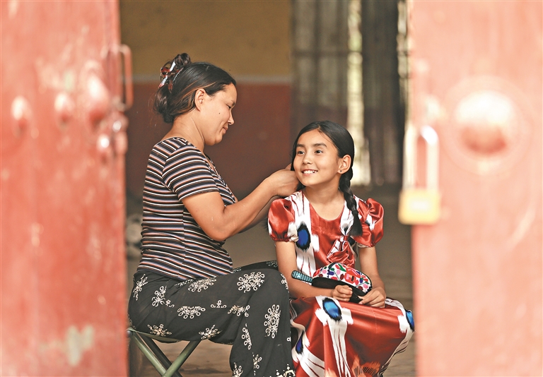 7月23日,在新疆和田策勒县渠勒村,帕提曼罕·排日海提的妈妈教她编辫子。妈妈一边教,一边念叨:“要去北京啦,得把自己收拾得漂漂亮亮的。”