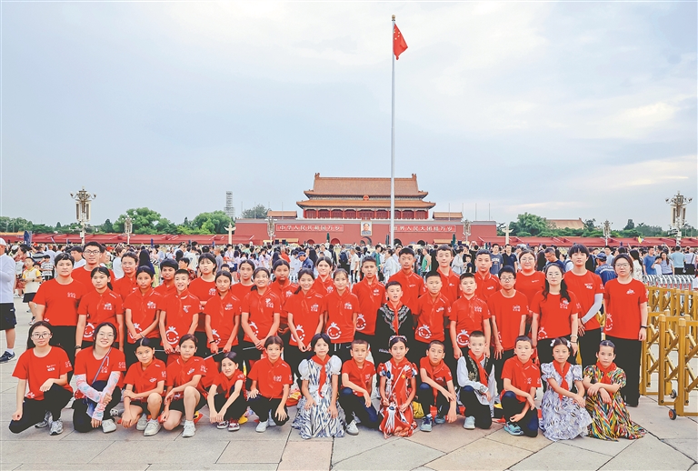 7月31日,帕提曼罕·排日海提(前右六)和参加夏令营的小伙伴及带队老师在天安门广场观看升旗仪式后合影留念。