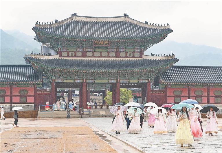 8月6日,游客在韩国首尔景福宫参观。