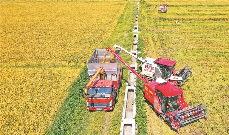 8月7日,在浙江省温岭市箬横镇百亩坦村,农民在田头开展早稻收割作业(无人机照片)。当日是立秋,始入秋季,万物开始由葱郁向结实转变。