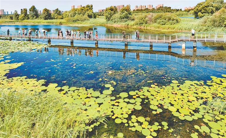 近日,哈尔滨文化中心湿地公园内,湿地里的水生植物生长茂盛,成片的芦苇、荷叶随风摇摆,美丽的荷花点缀其间。清澈的水面倒映着两岸的风光,数十只野鸭、白骨顶鸡在觅食、嬉戏。蜿蜒曲折的栈道伸向湿地深处,游人一边漫步一边近距离观赏水鸟,并用手机记录下精彩瞬间。