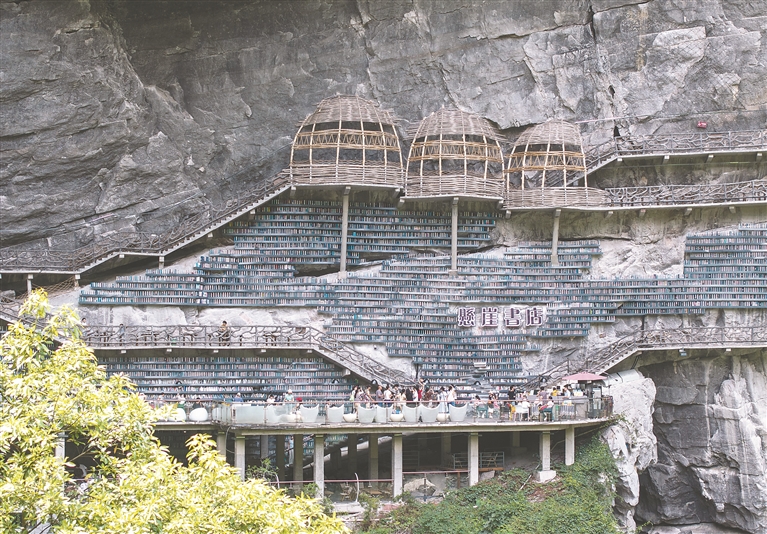 8月9日,游客在广西河池市罗城仫佬族自治县棉花天坑景区内的悬崖书店游玩。