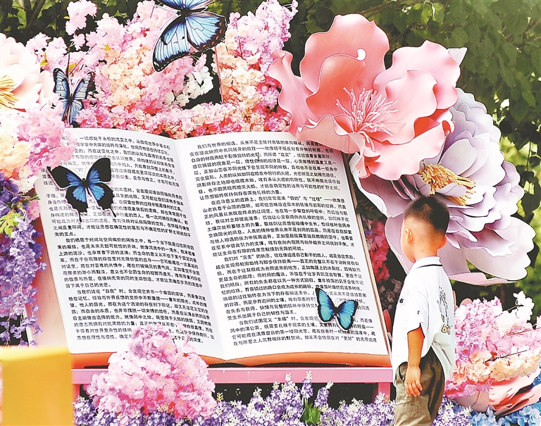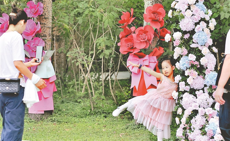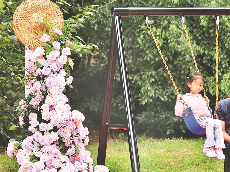 近日,哈尔滨市道里区群力丁香公园内,许多家长带着孩子在游玩。园内新增多个游乐设施,还新设了一些供游人打卡拍照的布景。部分树木、灯杆上设置了色彩艳丽的绢花、草帽等装饰物,公园变得更加美丽。