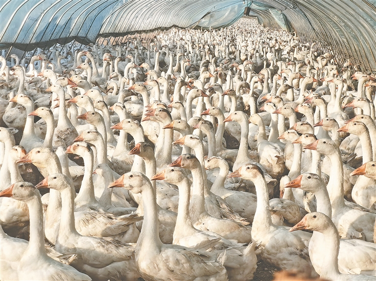 “全国大鹅领域,咱是首个‘双标合璧’的,全省独一份。”讲解员自豪地介绍。顺着他手指的方向望去,6辆三轮车正穿梭在饲料场与鹅棚之间,车斗里堆满了混着玉米碎粒的青绿料。“从凌晨5点到傍晚5点,这6辆车就没歇过,一天下来得拉10吨料才够28.7万只鹅吃。”张禄峰往鹅棚走了几步,棚里传来此起彼伏的“嘎嘎”声,昼夜值班员工30多位,白班员工正忙着分撒饲料,有的弯腰清理鹅舍,有的在守护池塘里畅游的鹅群。