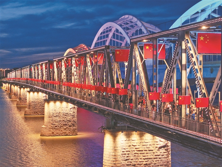 17日晚,哈尔滨市滨洲铁路桥桥头,“隆重纪念中国人民抗日战争暨世界反法西斯战争胜利80周年”的立体铁艺主题造型安装完毕,桥身800余面鲜艳的五星红旗耀眼闪亮,将这座百年老桥装点成亮丽的“国旗桥”。据悉,这是哈尔滨市为纪念中国人民抗日战争暨世界反法西斯战争胜利80周年特别打造的红色地标。