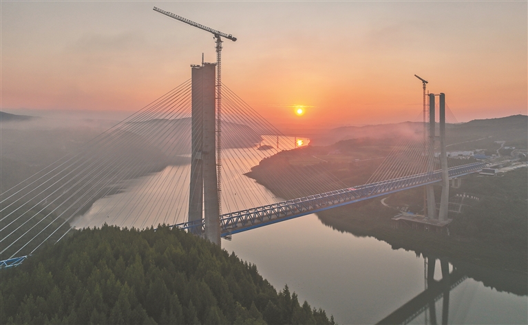 8月18日,由中铁十一局承建的西安至十堰高速铁路(简称“西十高铁”)汉江特大桥钢桁梁顺利合龙。汉江特大桥位于湖北省十堰市,跨越丹江口水库库区,是西十高铁全线控制性工程,全长917.45米,主跨420米。本次合龙的钢桁梁全长840米、宽11米、高9.4米,采用渐变三角桁式结构,最重桁节36.4吨。