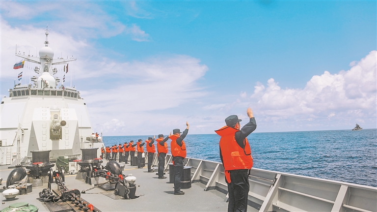 8月20日,中俄海上联合编队在西太平洋某海域举行分航仪式,中方官兵整齐站泊挥手告别。